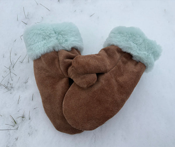 These super cozy mittens feature embossed leather tops and tan suede leather palms. They are lined with thinsulate and a minky faux fur. This pair is a ladies medium which fit most ladies.
